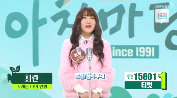 '아침마당-도전 꿈의 무대' 최란이 "나처럼 아픈 사람들에게 희망이 되고 싶다"며 노래했다. 20일 오전 방송한 KBS 1TV '아침마당-도전 꿈의 무대'에는 초대가수 김성환이 출연했다. 이날 첫 도전자