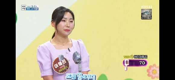 20일 오전 방송한 KBS 1TV '아침마당-도전 꿈의 무대'는 '주부 스타 탄생!'으로 꾸며진다. 화상 입은 아버지를 위해 노래하는 이해진이 첫 주자로 나섰다.